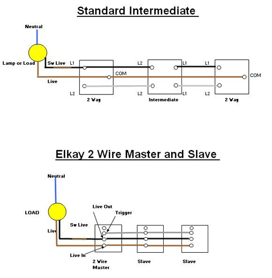 The wiring above can be used for time switches as Elkay Energy Management Switches and controls from the Energy Sense, Style and Outdoor range can utilise all these in the Master and Slave setup as shown.